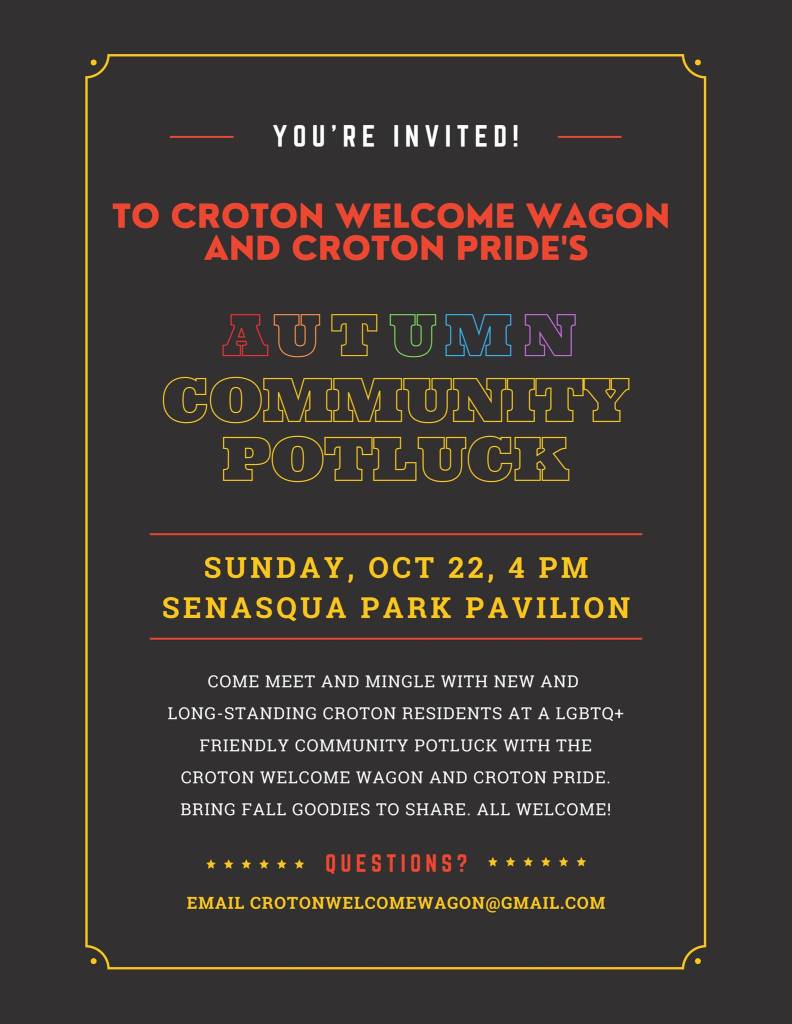 It’s that time again–join us for an Autumn Potluck at Senasqua Park, co-sponsored by the Croton Welcome Wagon and Croton Pride, Everyone is welcome, from long-time residents to brand-new neighbors. Come mix and mingle, make some new friends, and enjoy delicious snacks next to the beautiful Hudson. We’re looking forward to seeing you there!