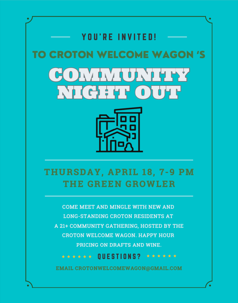Come mix and mingle with new and long-standing Croton residents at this 21+ community gathering at The Green Growler! Happy Hour pricing on drafts and wine, snacks will be served. We hope to see you there!